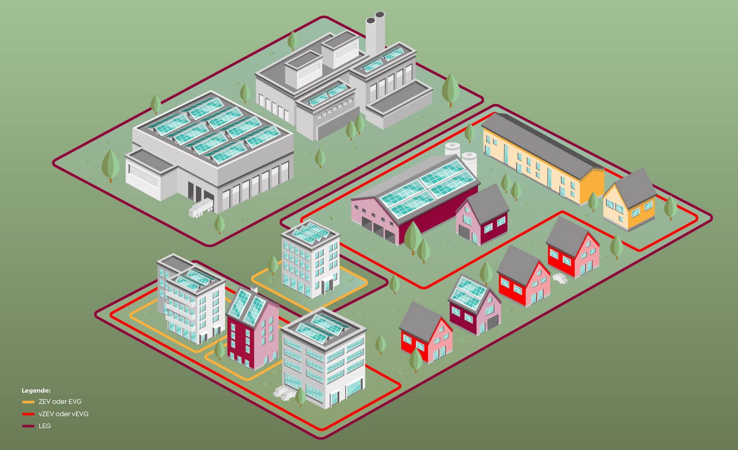 À partir de 2026, les propriétaires d’installations solaires et les consommateurs d’électricité pourront se partager directement et quasiment en temps réel l’électricité produite localement. Cela sera possible s’ils sont dans la même commune et la même zone de réseau, y compris via le réseau de distribution public. Dans une communauté électrique locale (CEL), aspects écologiques et économiques vont de pair. Le nouveau modèle de CEL est une extension logique des modèles de consommation propre RCP, RVCP et CA. Notre produit Community sera donc élargi à la CEL en 2026.