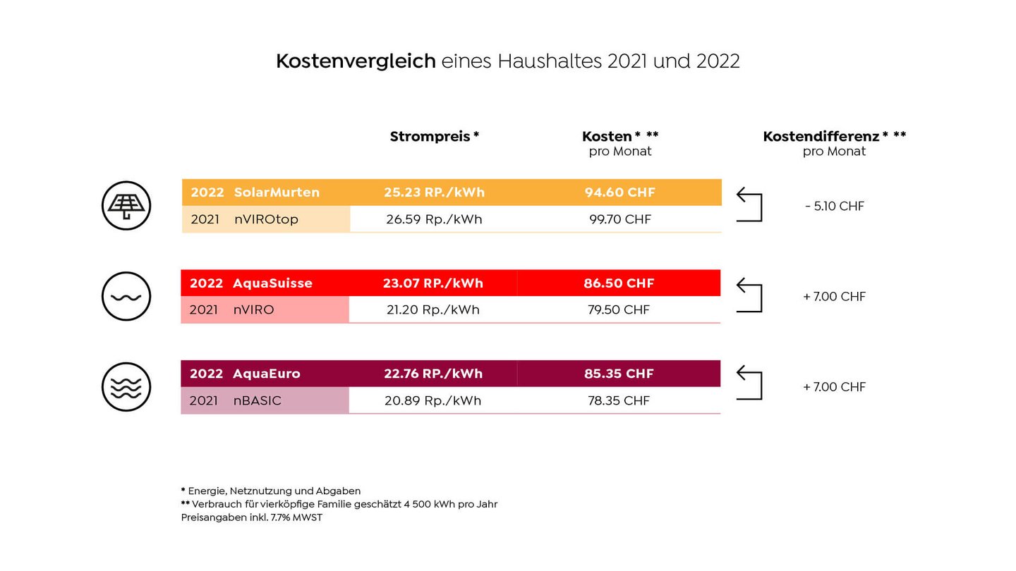 Alle bereits bestehenden Verträge werden vom bisherigen Stromtarif auf das jeweilige Tarif-Pendant der Stromtarife 2022 überschrieben: nBASIC wird zu AquaEuro, nVIRO wird zu AquaSuisse und bei den Verträgen mit dem Tarif nVIROtop gibt es eine Anpassung zu SolarMurten. Die Möglichkeit Ihren Stromtarif anzupassen, besteht auch noch zu einem späteren Zeitpunkt, jeweils per 1. Januar und 1. Juli.