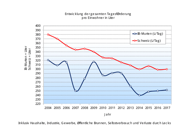 In den 90er Jahren betrug der Wasserbrauch in der Gemeinde Murten noch über 300 Liter pro Person und Tag. 2017 waren es durchschnittlich nur noch 252 Liter – eine erfreuliche Entwicklung. Der bewusste Umgang mit Wasser ist sehr wichtig für unsere Umwelt. Als Versorger, dem eine schonende Nutzung der Ressourcen wichtig ist, freut uns das sehr.